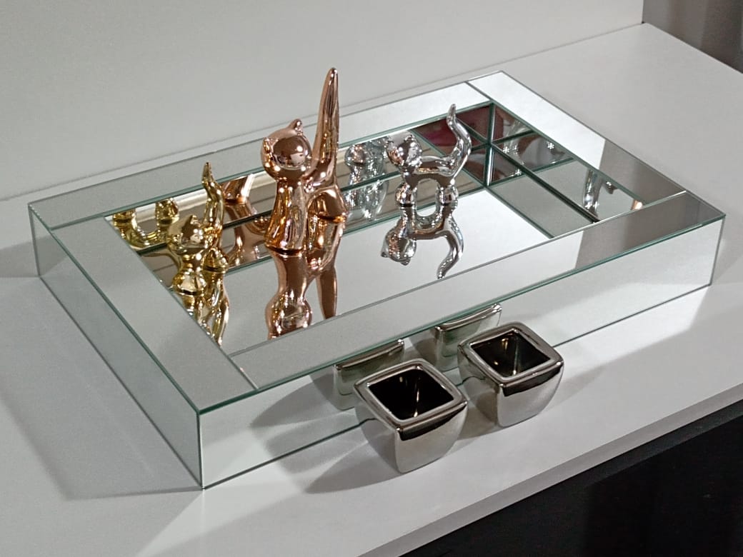 Bandeja toda espelhada medindo 40 cm x 25 cm x 6 cm altura, espelho nacional, sem bisotê.